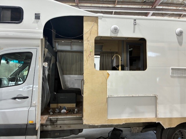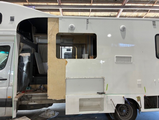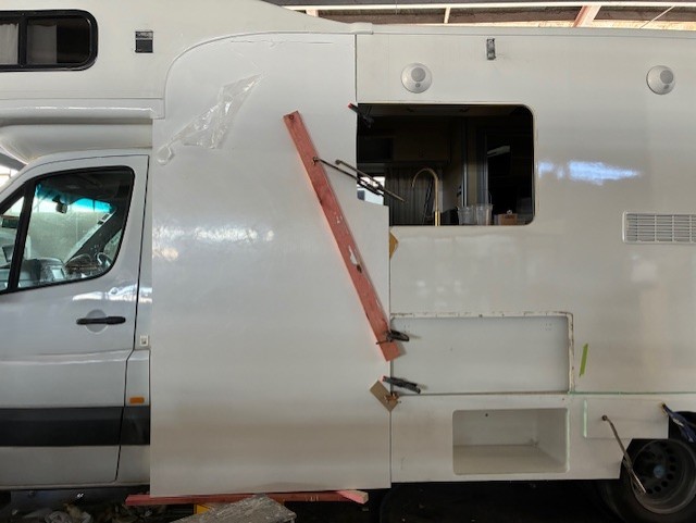 A 6-berth rental motorhome was delivered to our workshop after sustaining significant damage in a road accident. The side entrance door had been torn off, taking part of the side wall, the entrance step, and most of the lower side trim with it. With the client relying on this vehicle for their busy holiday season, the turnaround timeframe was just two weeks.